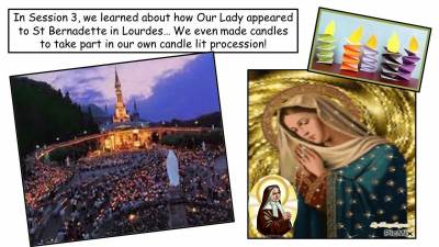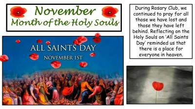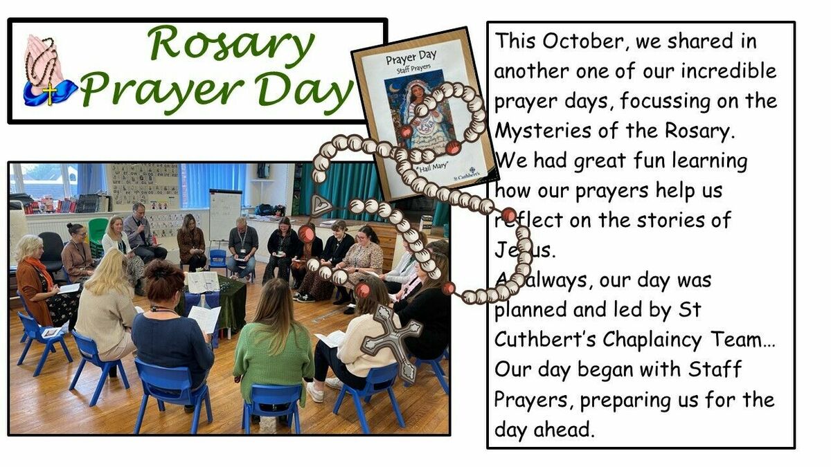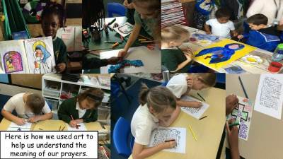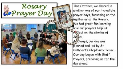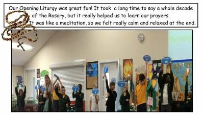 We have daily collective worship in school either in classrooms or in the school hall when we gather together as a school family. Children also pray daily in their classroom which can take a variety of forms. Rosary is prayed each week in our Rosary club, with a particular focus in May and October for the whole school.