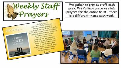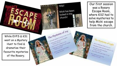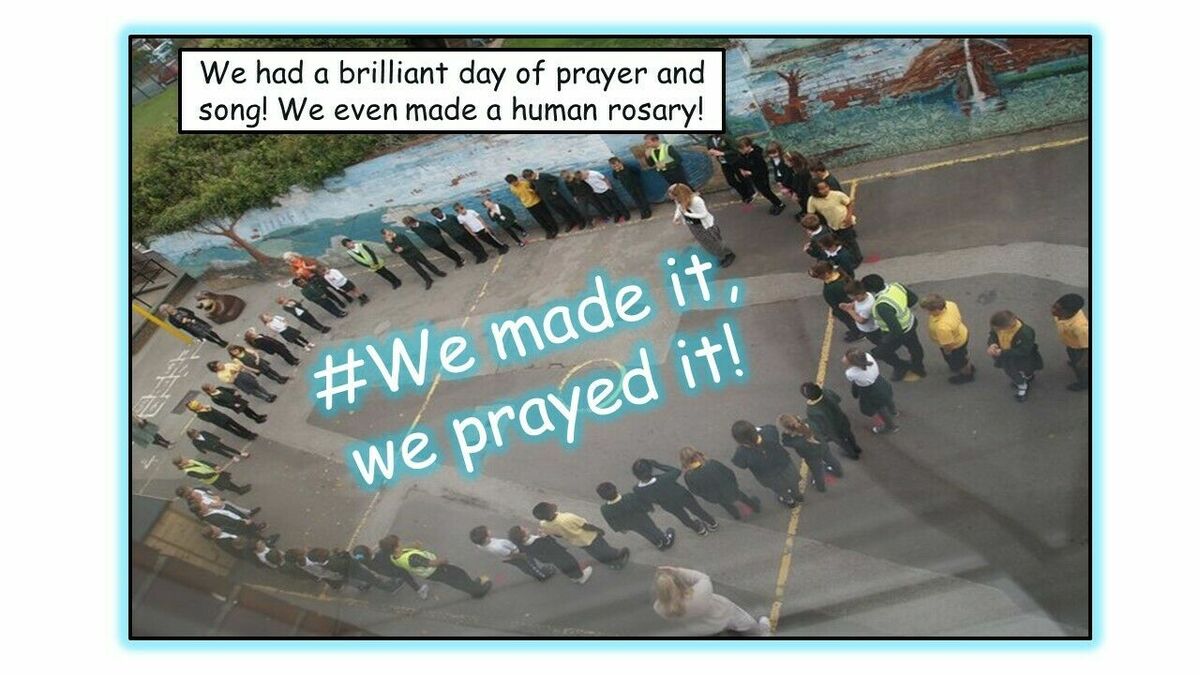 We have daily collective worship in school either in classrooms or in the school hall when we gather together as a school family. Children also pray daily in their classroom which can take a variety of forms. Rosary is prayed each week in our Rosary club, with a particular focus in May and October for the whole school.
